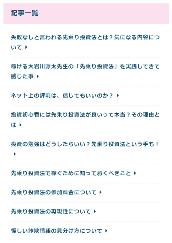 また、サイト内には大岩川源太氏や先乗り投資法以外の記事が一切ないことも特徴です。